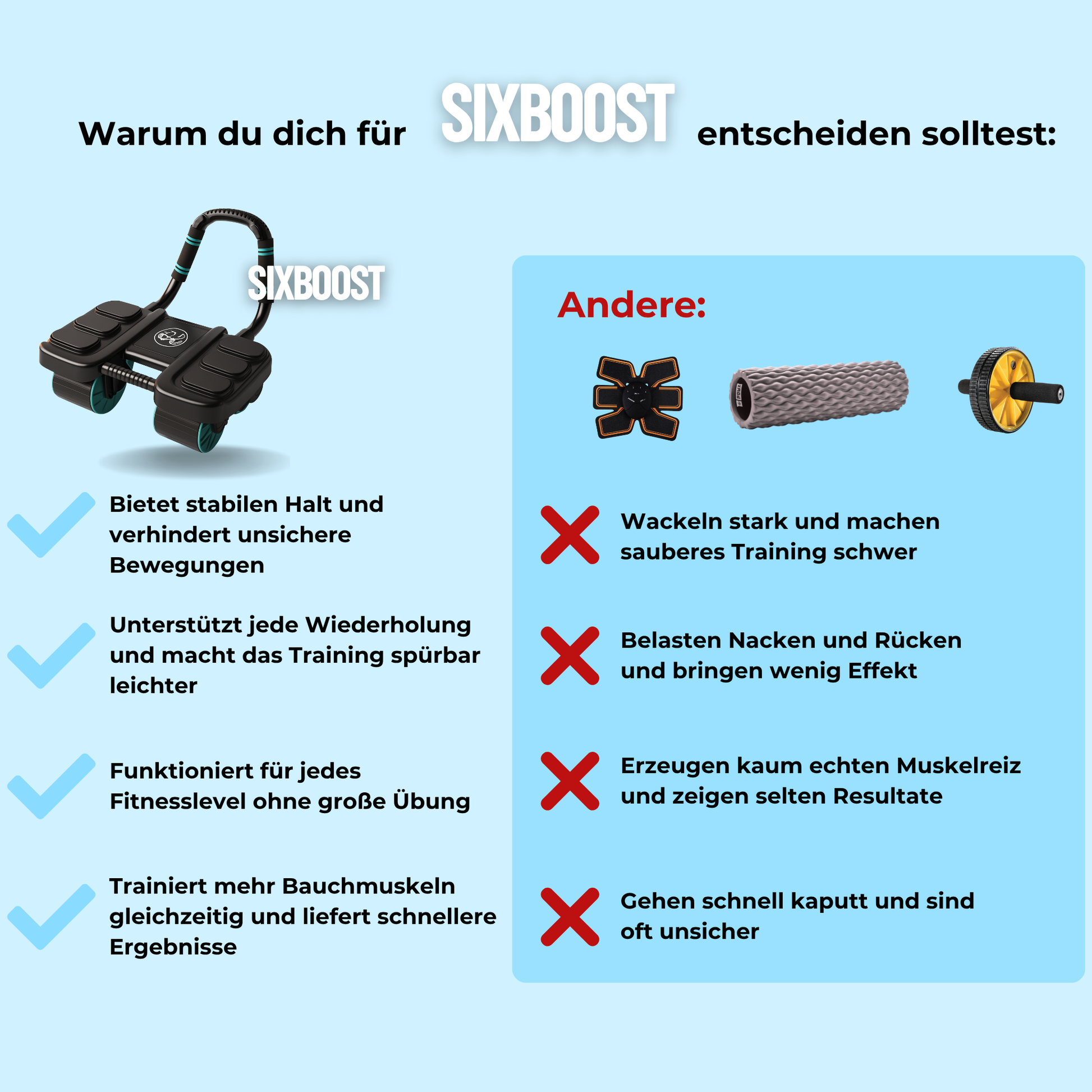 Sixboost wurde für die moderne Fitness-Welt entwickelt. Mit vier robusten, rutschfesten Rädern bieten wir eine beispiellose Stabilität. Du kannst dich vollständig auf die Kontraktion deiner Bauchmuskeln konzentrieren. Wir liefern die Stabilität eines Fitnessgeräts direkt zu dir nach Hause. Das ist der Unterschied zwischen 10 halbherzigen und 20 perfekten Wiederholungen.